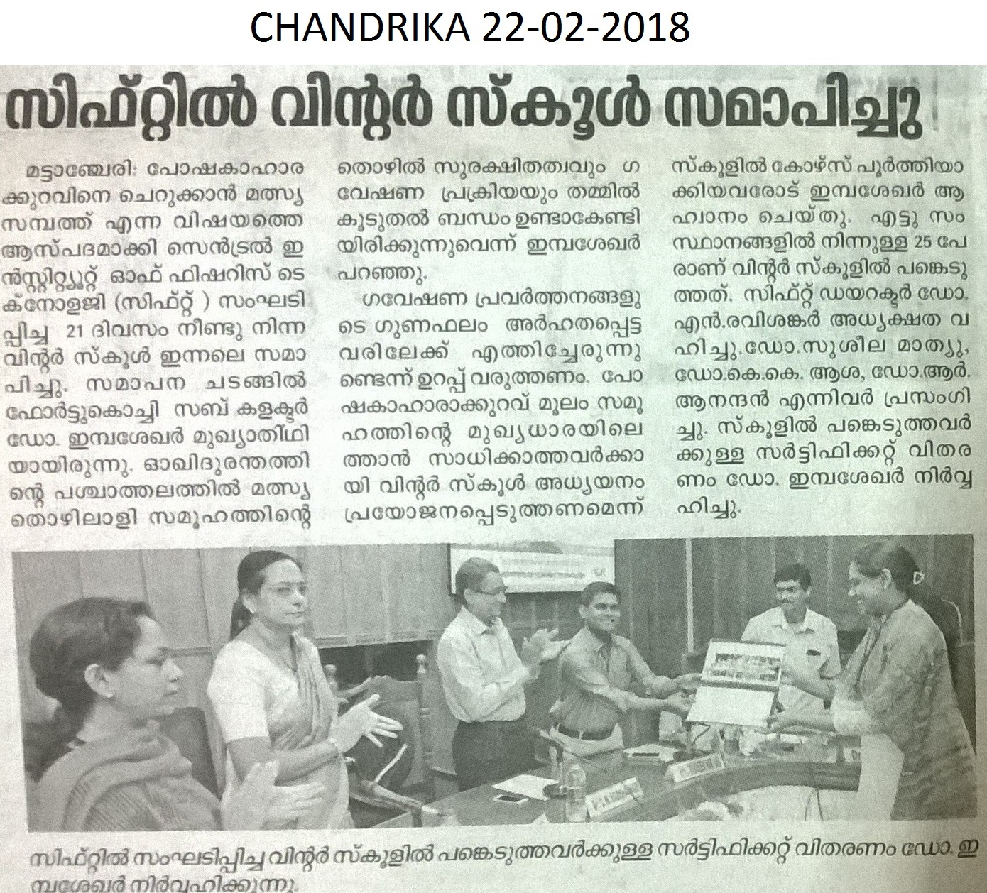 "പോഷണക്കുറവിനെ പ്രതിരോധിക്കാൻ സമുദ്രജന്യ പോഷകങ്ങൾ" എന്ന വിഷയത്തെ അധികരിച്ചു സിഫ്റ്റ് സംഘടിപ്പിച്ച 21 ദിവസത്തെ വിന്റർ സ്കൂൾ സമാപിച്ചു.